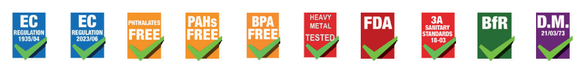 Standards: Reg. EC 1935/04 and CE 2023/06. Phthalates free. PAHs free (acc. to ZEK 01.4-08 Cat. 1). Bisphenol A free. Heavy metal tested. FDA tit.21 art.177.2600 aqueous and fatty foods. 3-A Sanitary Standards n°18-03 class II. BfR XXI Cat.2 foods. D.M. 21/03/73 aqueous, fatty foods and alcohol up to 96°